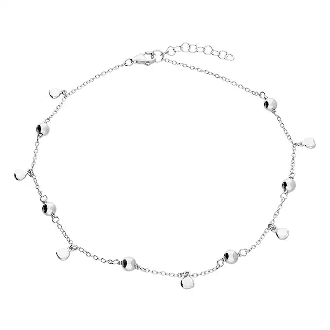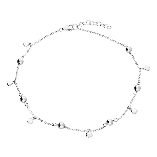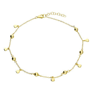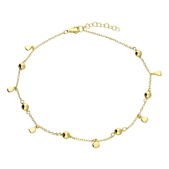 This unique anklet features alternating beads and organic disc that dangle from the chain. Availabe in gold-plated sterling silver, or sterling silver.