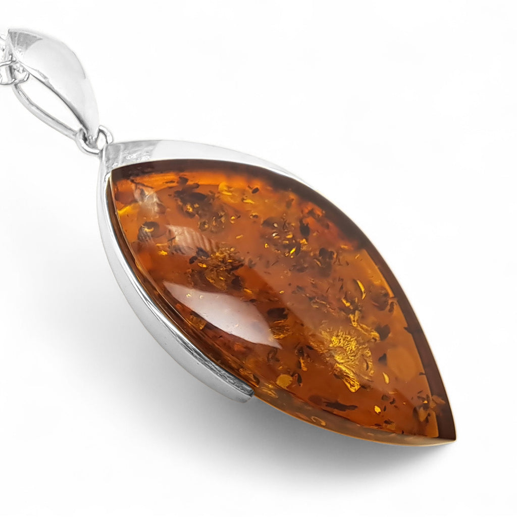 This large organic marquise-shaped sterling silver pendant features a lovely amber stone. It is hung from a 91cm medium oval belcher chain. The chain can be exchanged in store if you would prefer a different style or length.