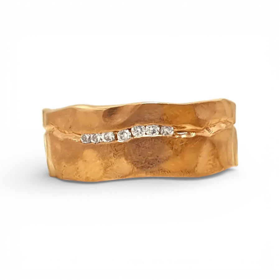 This striking ring by Deborah Kelly Hopkins celebrates texture, warmth and thoughtful craftsmanship. Formed in 9ct rose gold, the 6mm wide band has an organically worked surface, giving the piece a softly sculptural quality and a distinctly individual character. A gentle channel runs through the centre, set with seven diamonds that sit flush within the gold, catching the light without interrupting the ring’s natural flow.