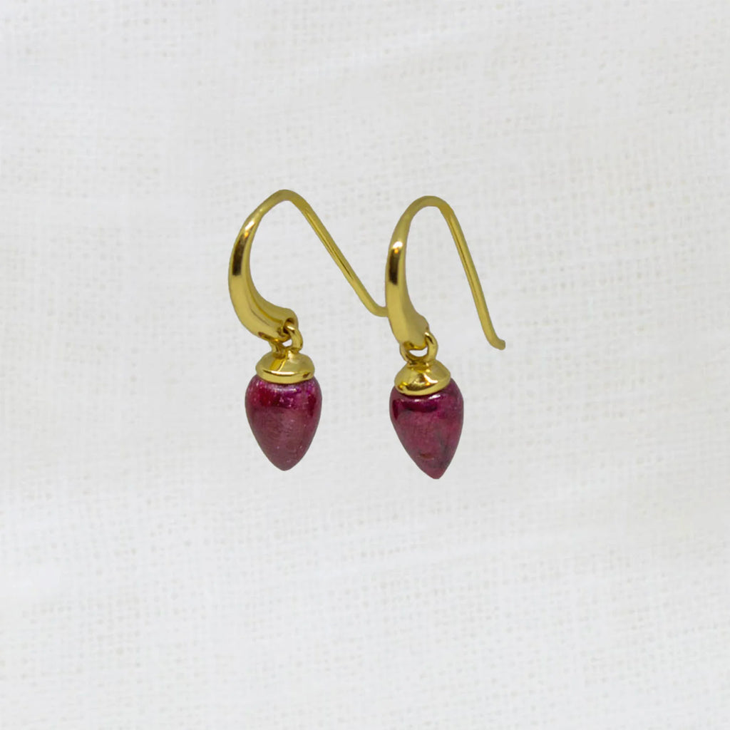 These gemstone and gold droplet earrings feature hand-cut teardrop shaped gemstones, which hang elegantly below a tapered hook fitting.