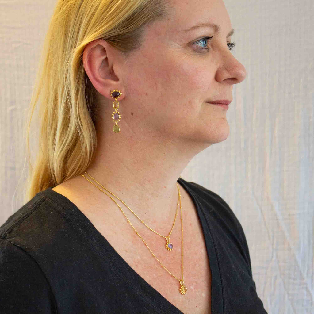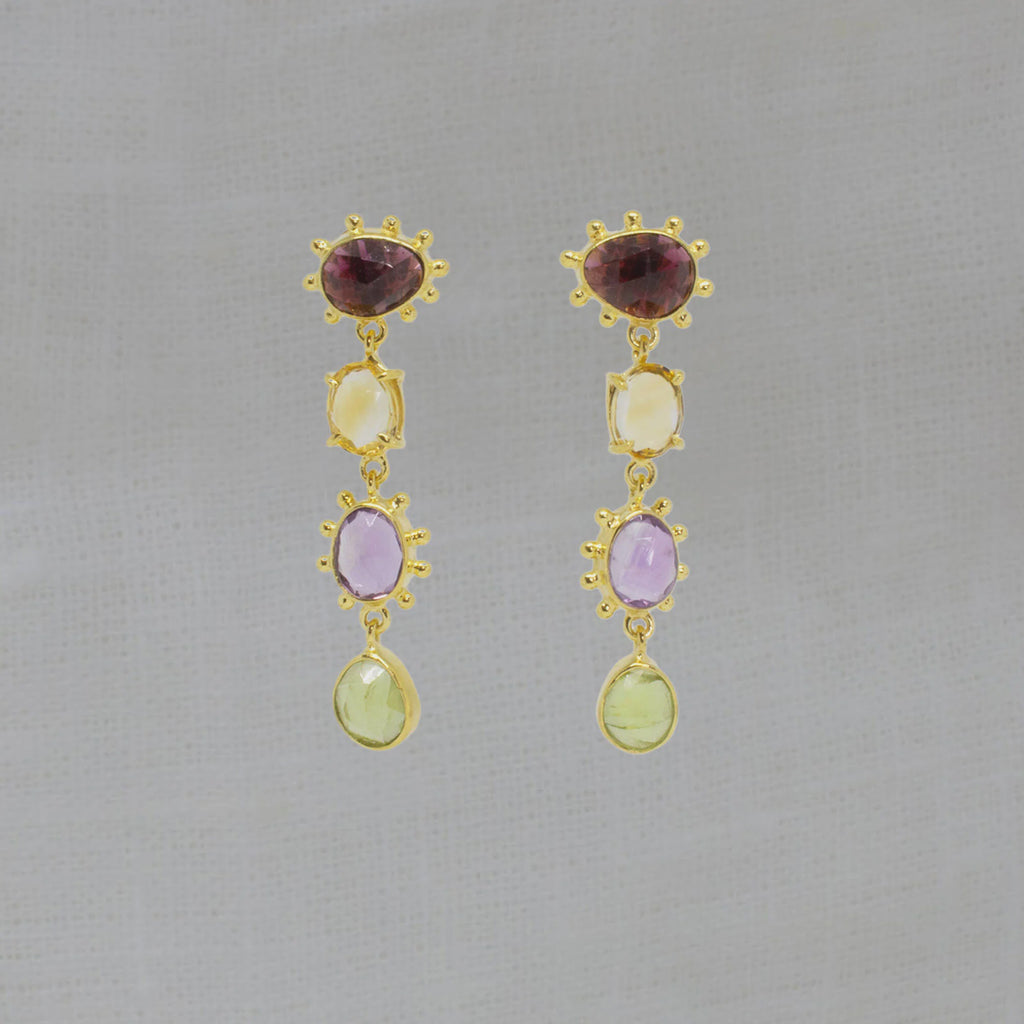 Our Banyan earrings are handmade in 18k gold plated silver and embellished with four natural gemstones in an ecletic combination of settings - Garnet, Citrine, Amethyst and Peridot*