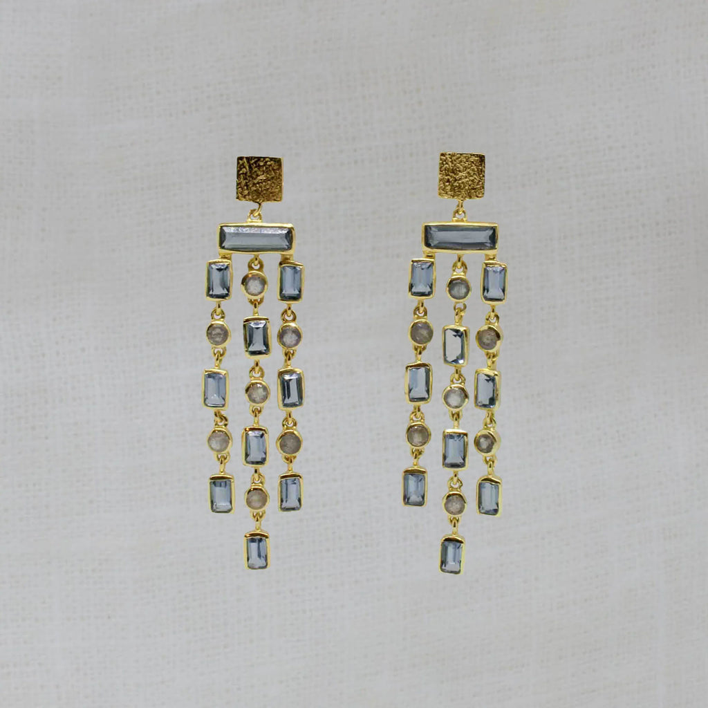 These triple row gemstone chandelier earrings are crafted in 18k gold vermeil. These statement earrings feature a stunning cascade of gemstones arranged in three rows, creating a chandelier effect. The square textured stud fitting adds a modern and sophisticated edge to this timeless design.