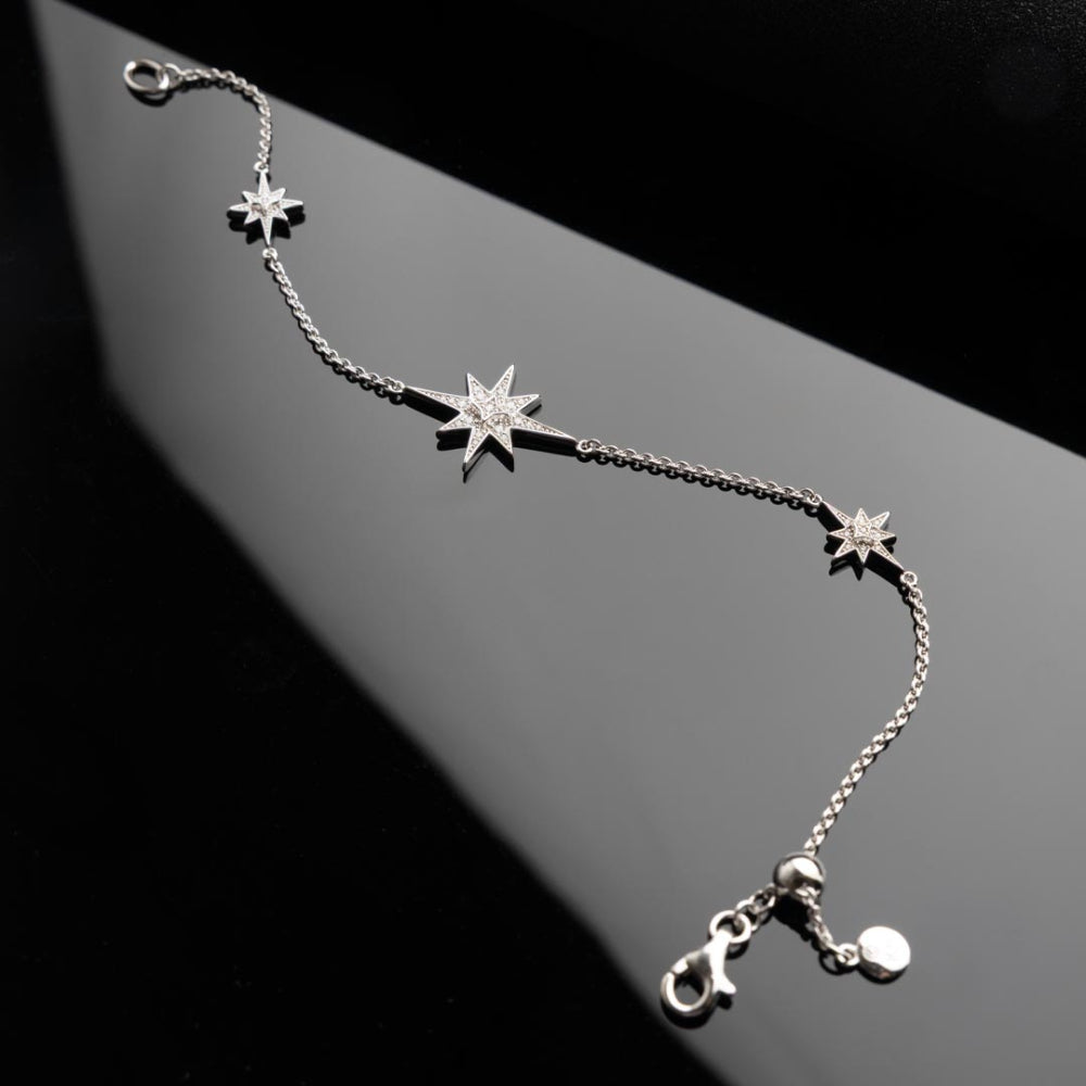 A first for our bracelet collection, our special winter 2025 edition North Star Pavé-set Cubic Zirconia Station Slider Bracelet will add radiant sparkle to your wrist this season. This delicate bracelet features three eight-pointed North Starburst radiating sparkle at every point and centre, connected along a fine chain. The adjustable slider clasp ensures the perfect fit for every wrist. A symbol of guidance and timeless brilliance, this striking bracelet will make a thoughtful, lasting and sparkling gift.