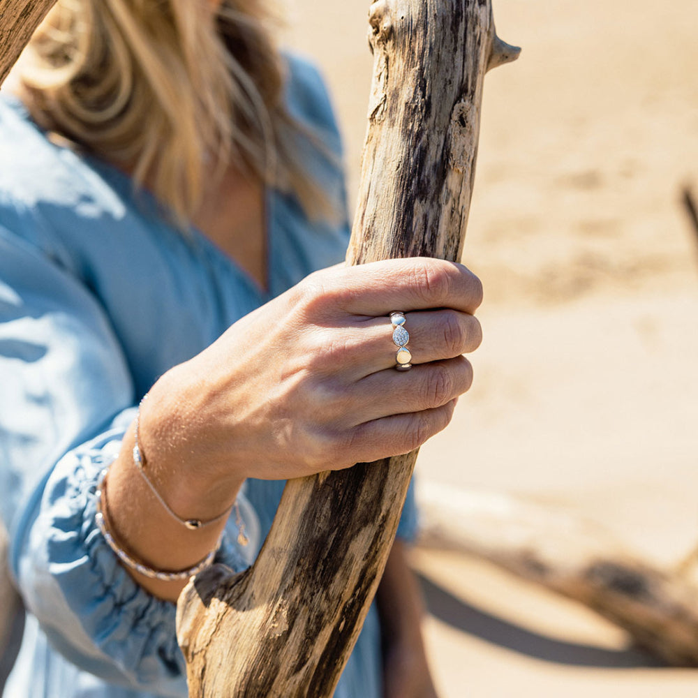 Like the sun glistening on the surface of the vast oceans, this row of smooth, organic shaped silver band is highlighted with a single sparkling pave embellished pebble. Inspired by our very own Devon coastline and golden yet naturally rugged British shores, this Coast Pebble Glisten ring is available in rhodium plated sterling silver and pave set cubic zirconia.