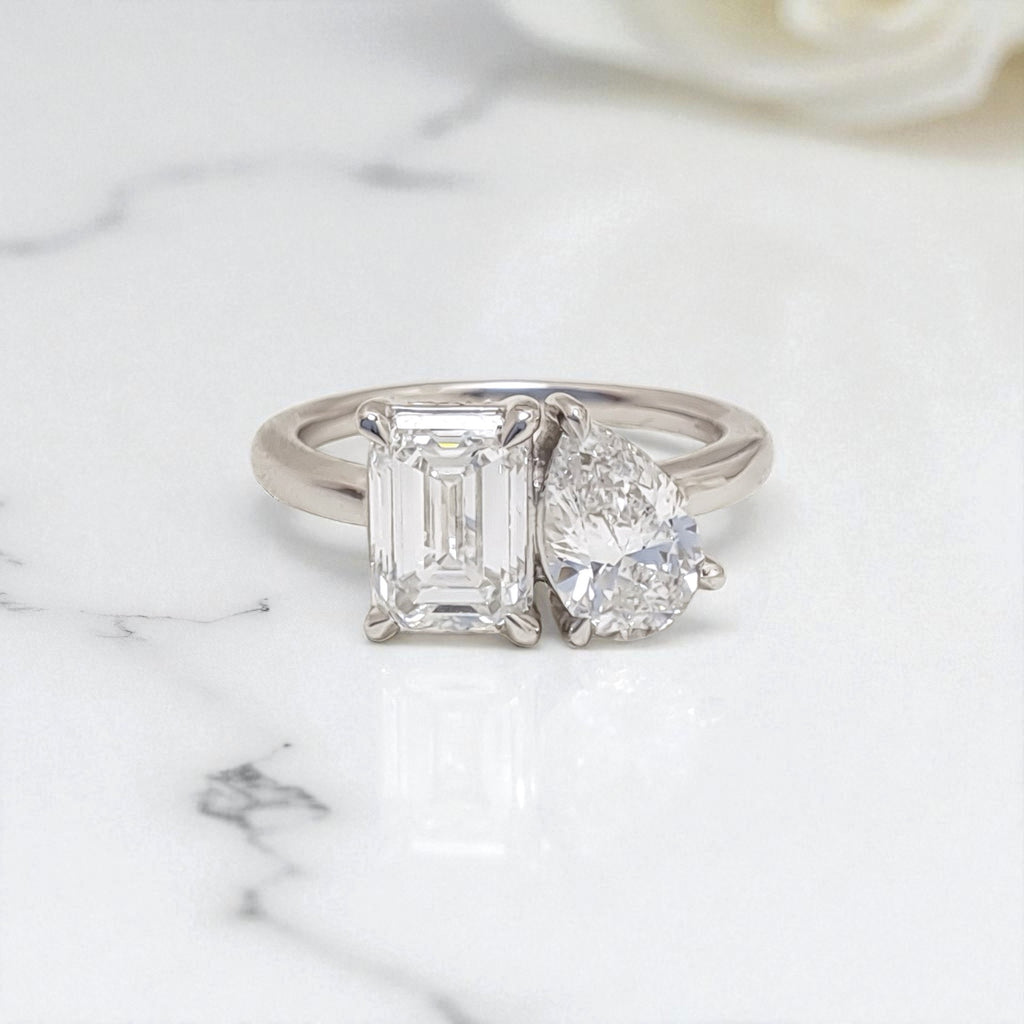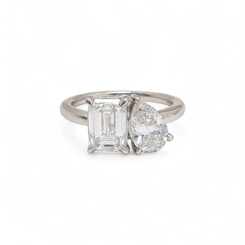 Two souls, one love. The Toi et Moi ring is a striking modern take on the romantic Toi et Moi design, where two exquisite diamonds sit side by side to symbolise the union of two hearts. Crafted in enduring platinum, this contemporary yet timeless ring showcases a 1.05ct emerald-cut step diamond paired with a 1.05ct pear brilliant-cut diamond. Both are lab-grown to the highest FVS2 standard, offering remarkable clarity, fire, and sparkle. With a total weight of 2.10ct, this statement piece radiates both meaning and brilliance - the perfect way to celebrate your forever.
