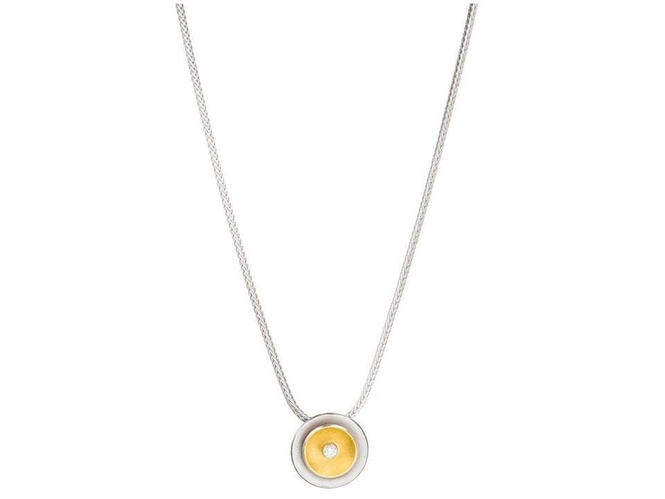 Delicate silver and gold layered discs with a central diamond, 0.03ct. The chain measures 16.5 inches, the pendant is 0.5 inches in diameter. The pendant comes on a silver 16.5" chain.
