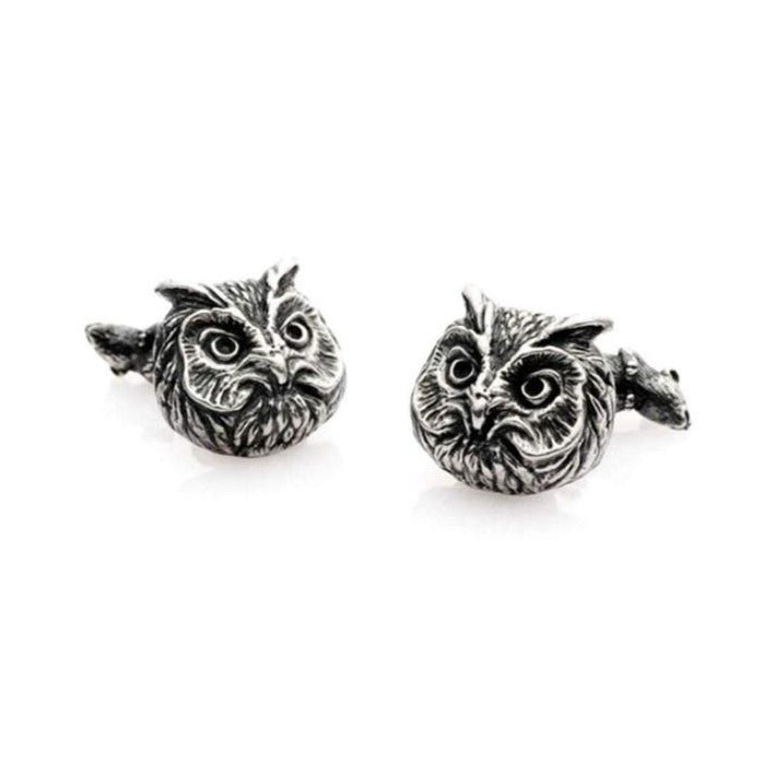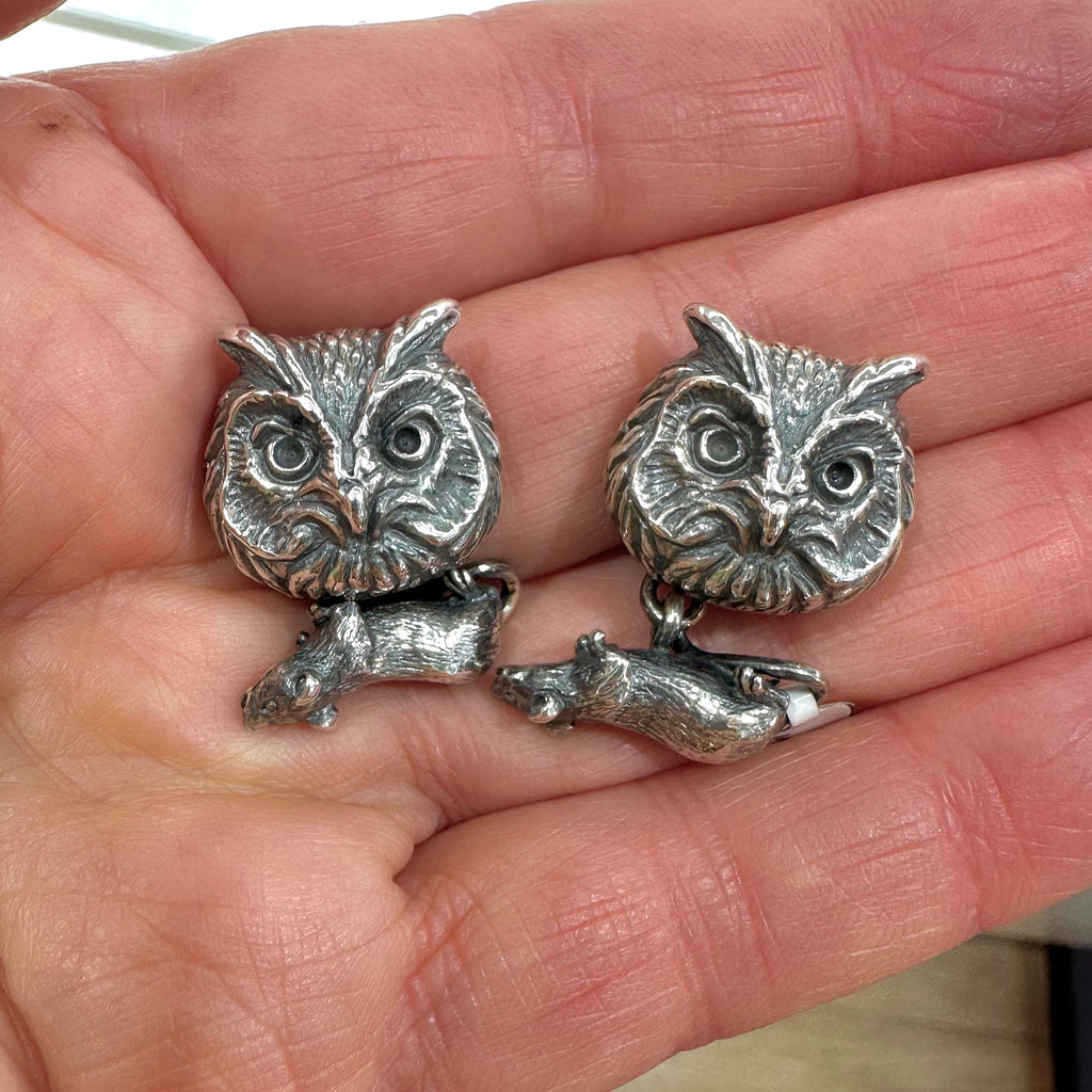For the man in your life who has (nearly) everything…. Beautifully handcrafted cufflinks in solid silver by talented British jeweller Chris Hawkins. These cufflinks are a witty take on nature’s predators - an owl and its prey, a small rat. The owl's face is approx 15mm at its widest point.