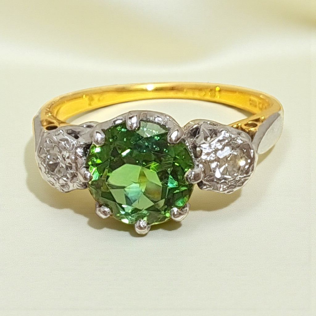 Vintage 18ct Yellow Gold and Platinum Polychromatic Green Tourmaline and Diamond Ring