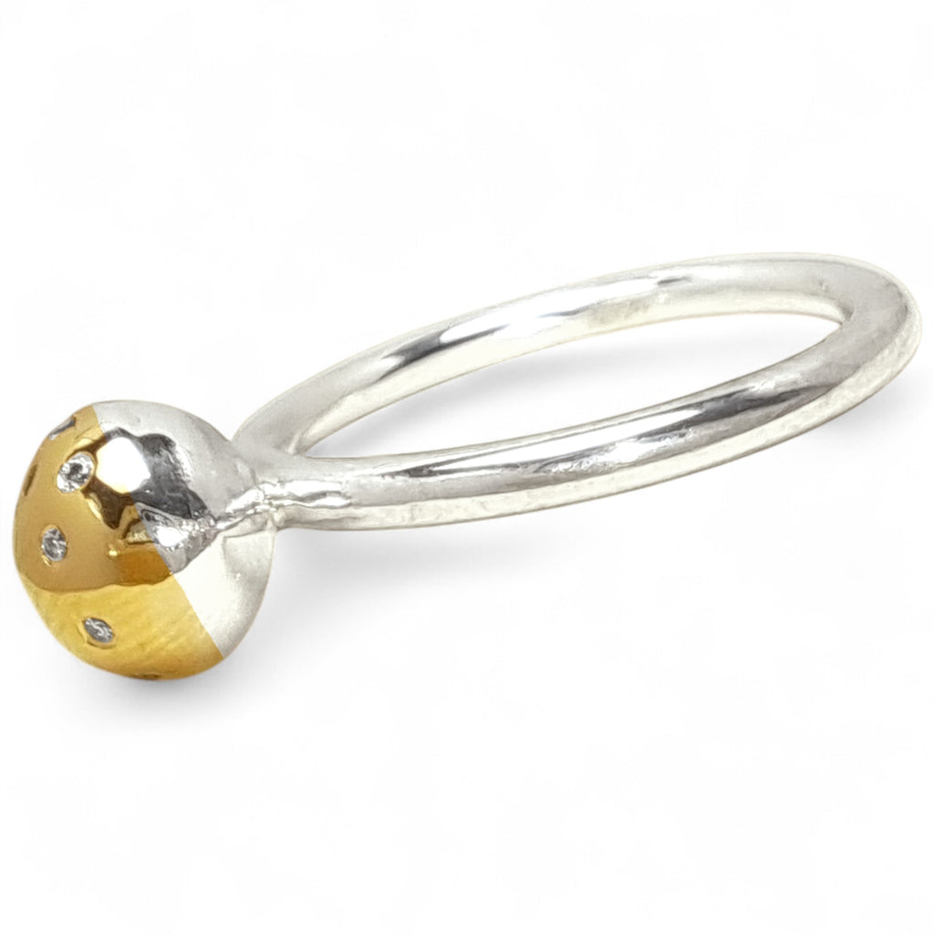 Small in size but big on sparkle - the WILDE Mini Half Sprinkle Pod Ring brings a touch of playful sophistication to your everyday look. Its petite gold dome, dotted with ten delicate diamonds, gleams atop a polished silver band. Perfect for stacking or wearing solo, this charming piece adds a subtle hint of luxury to any outfit.