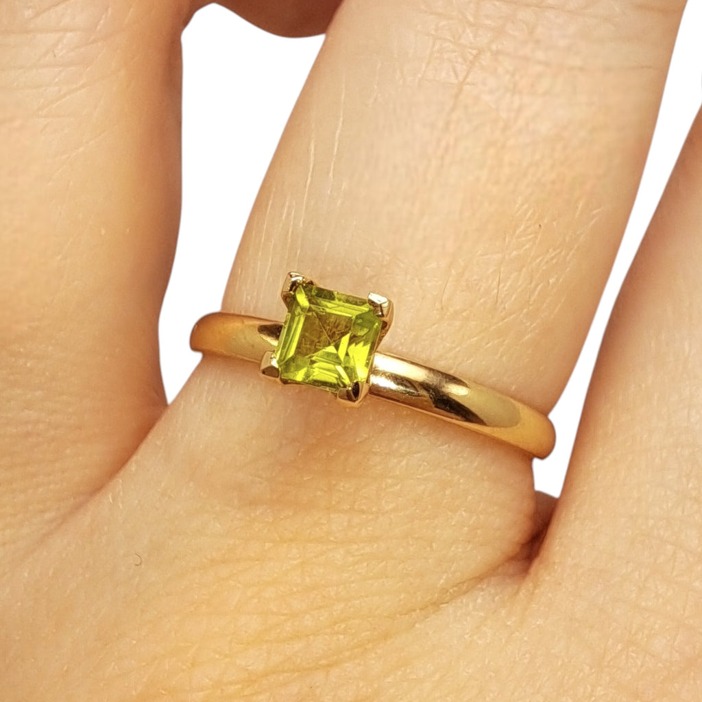 Hand crafted in 9ct Yellow Gold, this gorgeous stacking ring features a vibrant, 4mm, square-shaped peridot in a 4 claw setting.