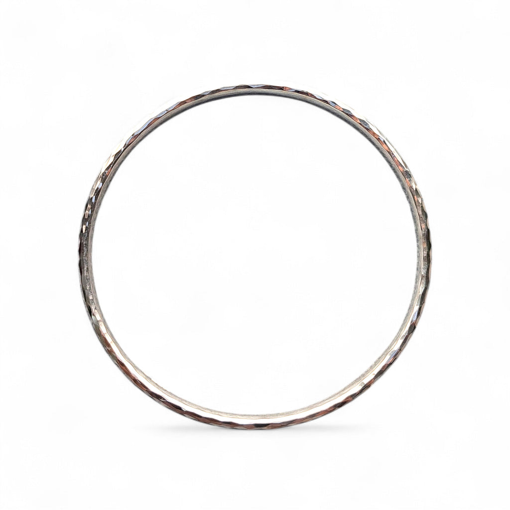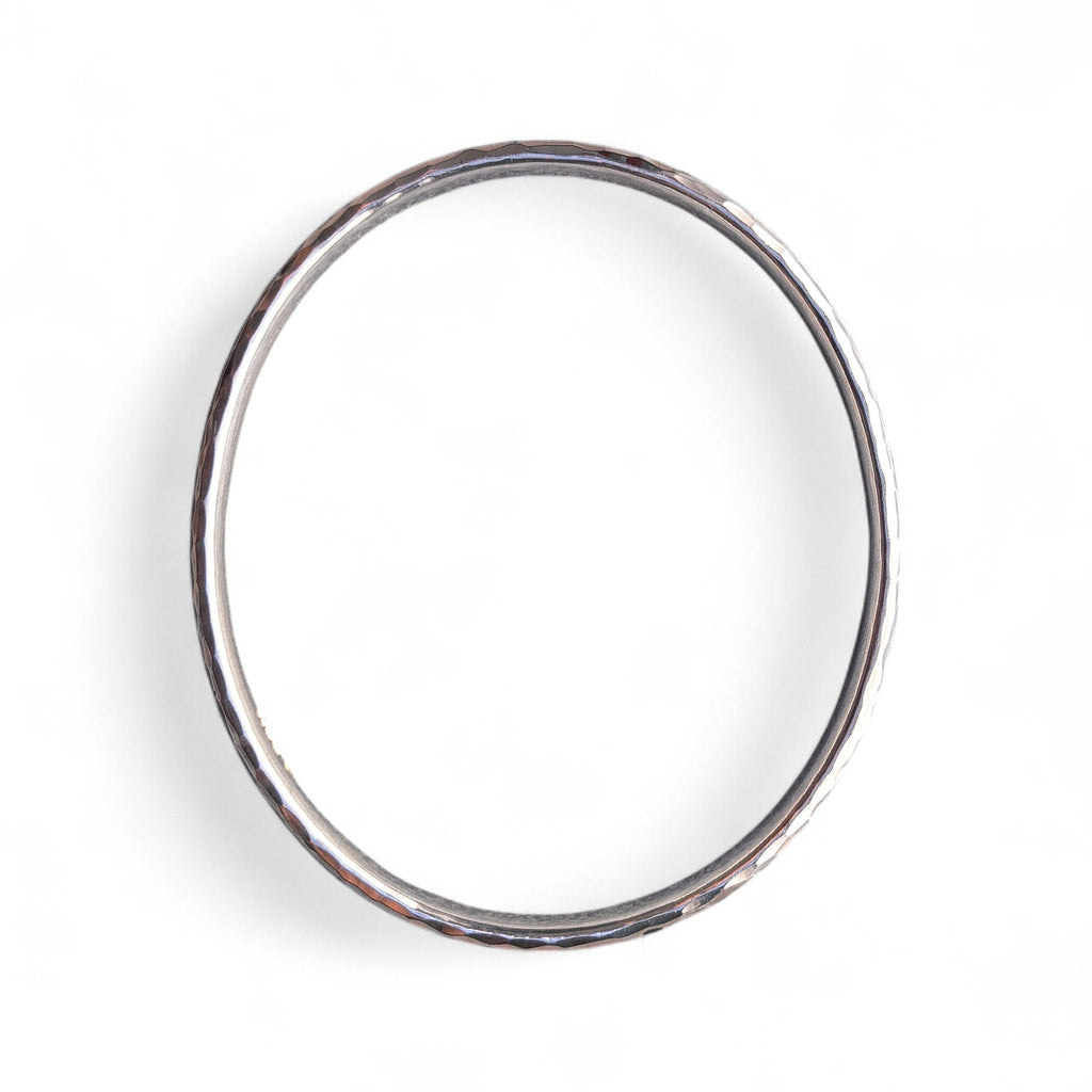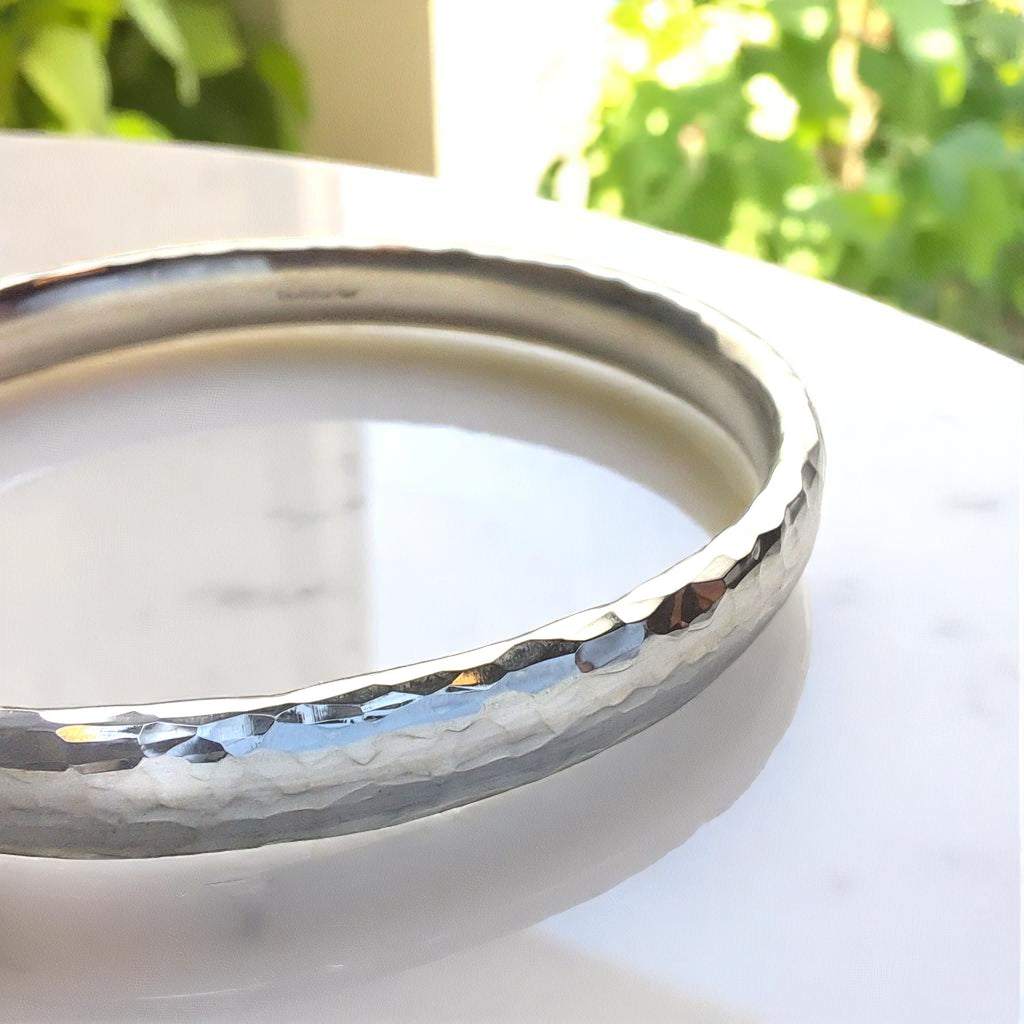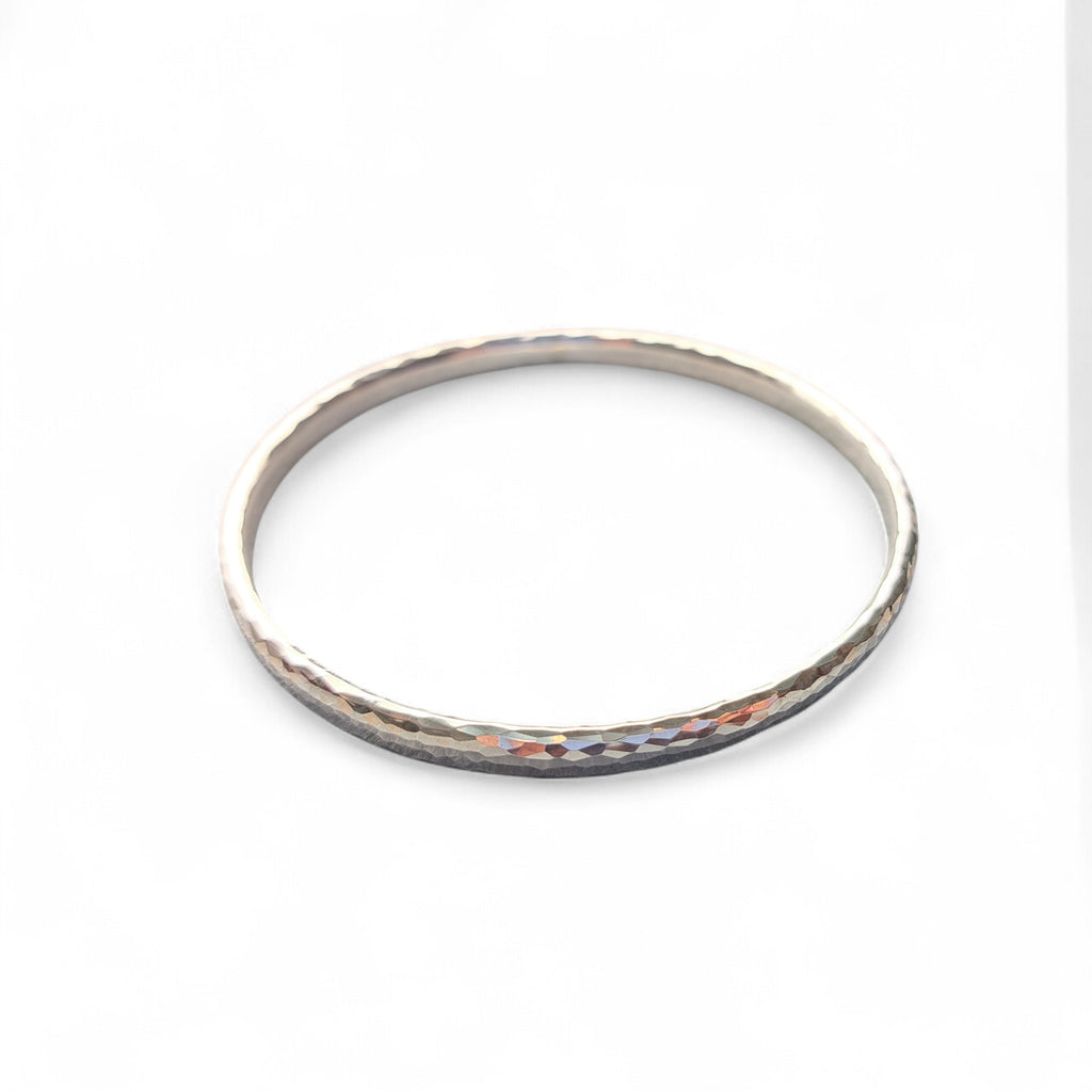8mm solid sterling silver bangle, available in a round or an oval shape, with a pretty hamemred finish.