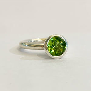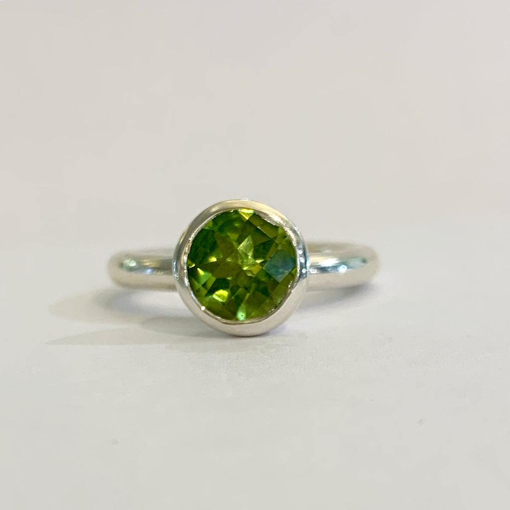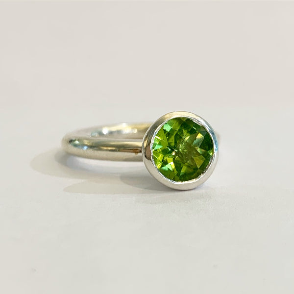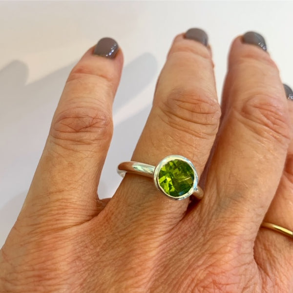An eye-catching sterling silver ring set with a gorgeous, chartreuse green peridot. Beautiful on its own, or stacked with another ring.