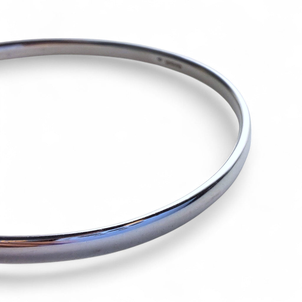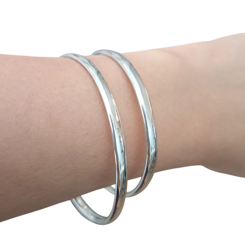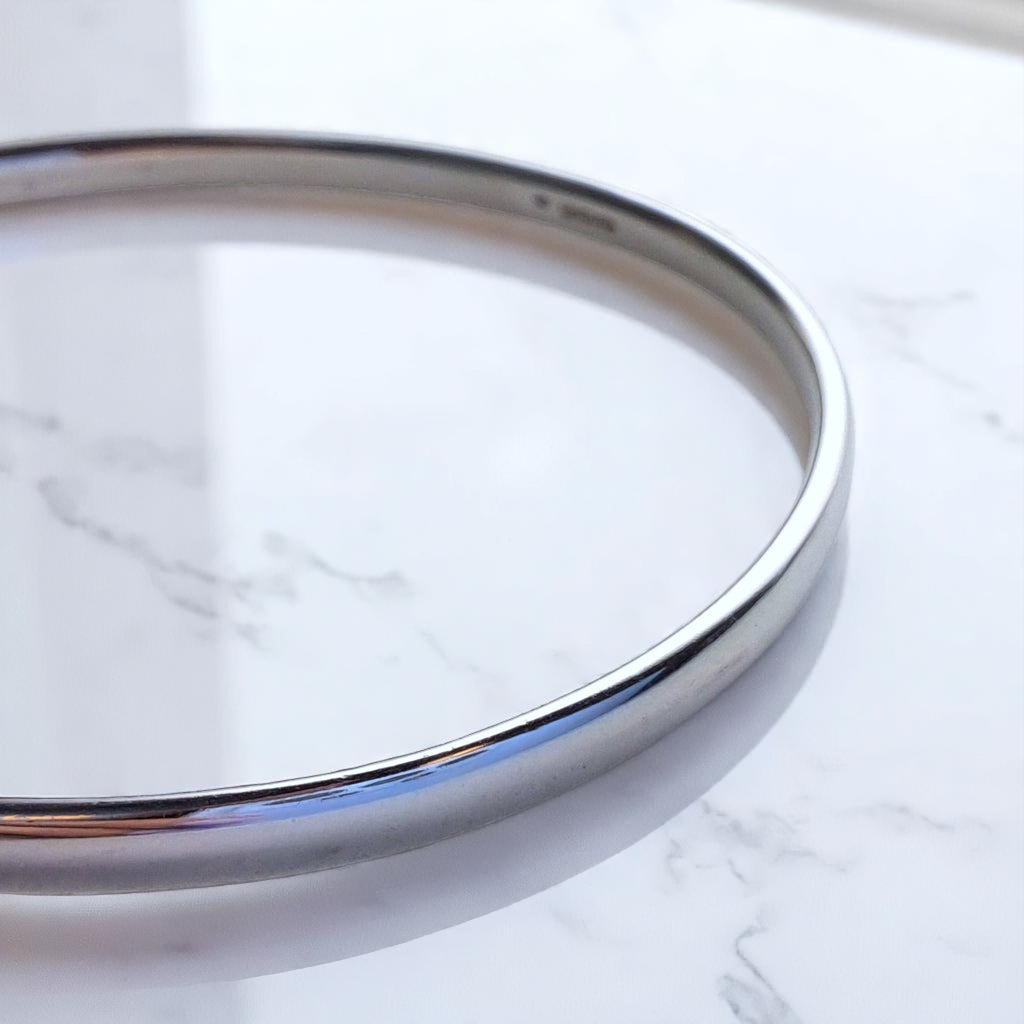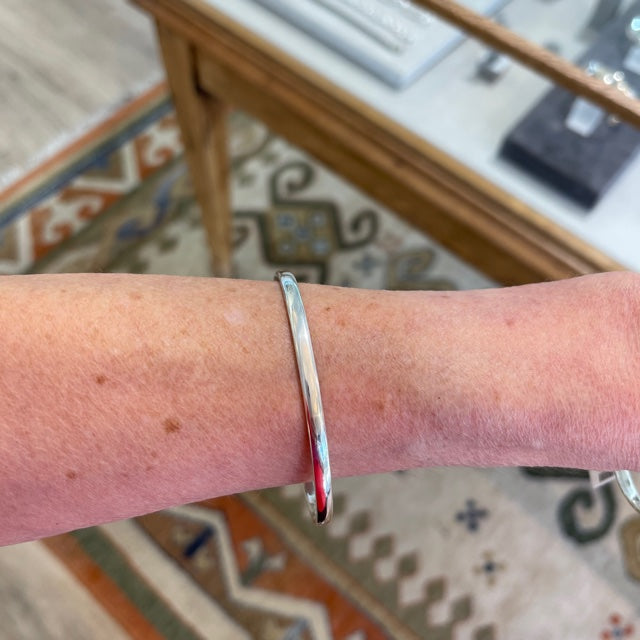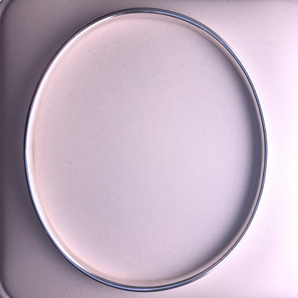 A 4mm oval-wire, solid silver bangle, in a luxurious polished finish. Available in a round or an oval shape.