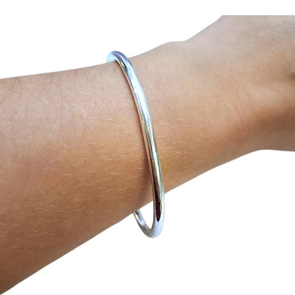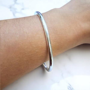 Solid silver bangle, in a luxurious polished finished. The bangle band is oval in shape and made from 4mm round silver wire.