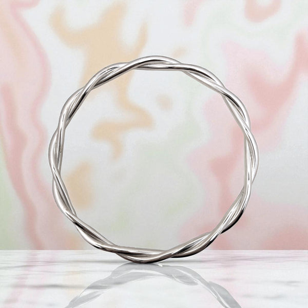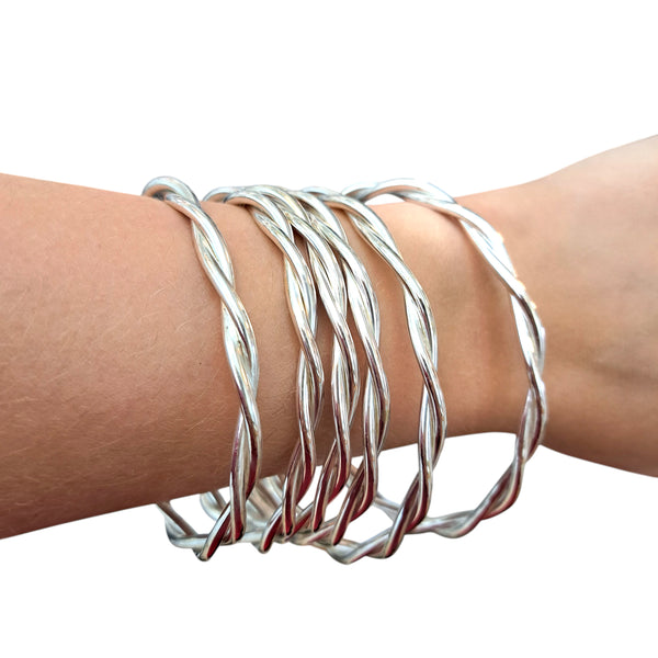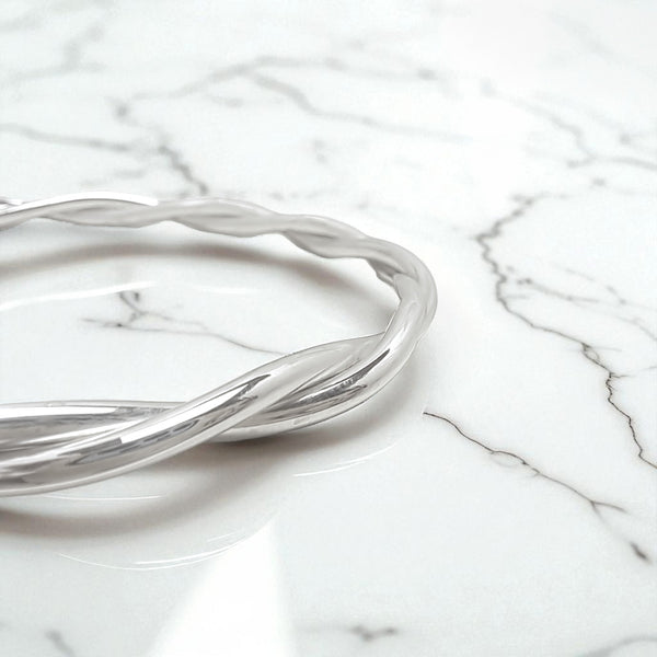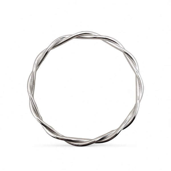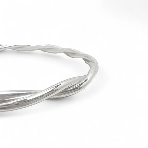 This striking bangle is handmade from two lengths of solid 3mm round sterling silver wire, twisted together to create a bold, sculptural look. The polished finish highlights the clean curves of the design, giving it a modern yet timeless feel. Comfortable to wear and easy to stack, it adds subtle texture to any jewellery collection.