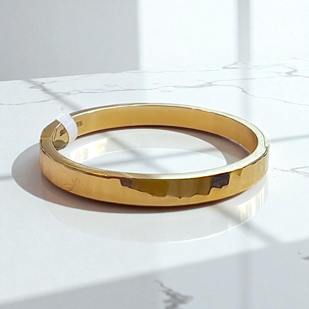 A gorgeous hand crafted, 9ct yellow gold, flat band with a bark texture that catches the light and adds a touch of sparkle!