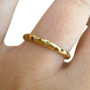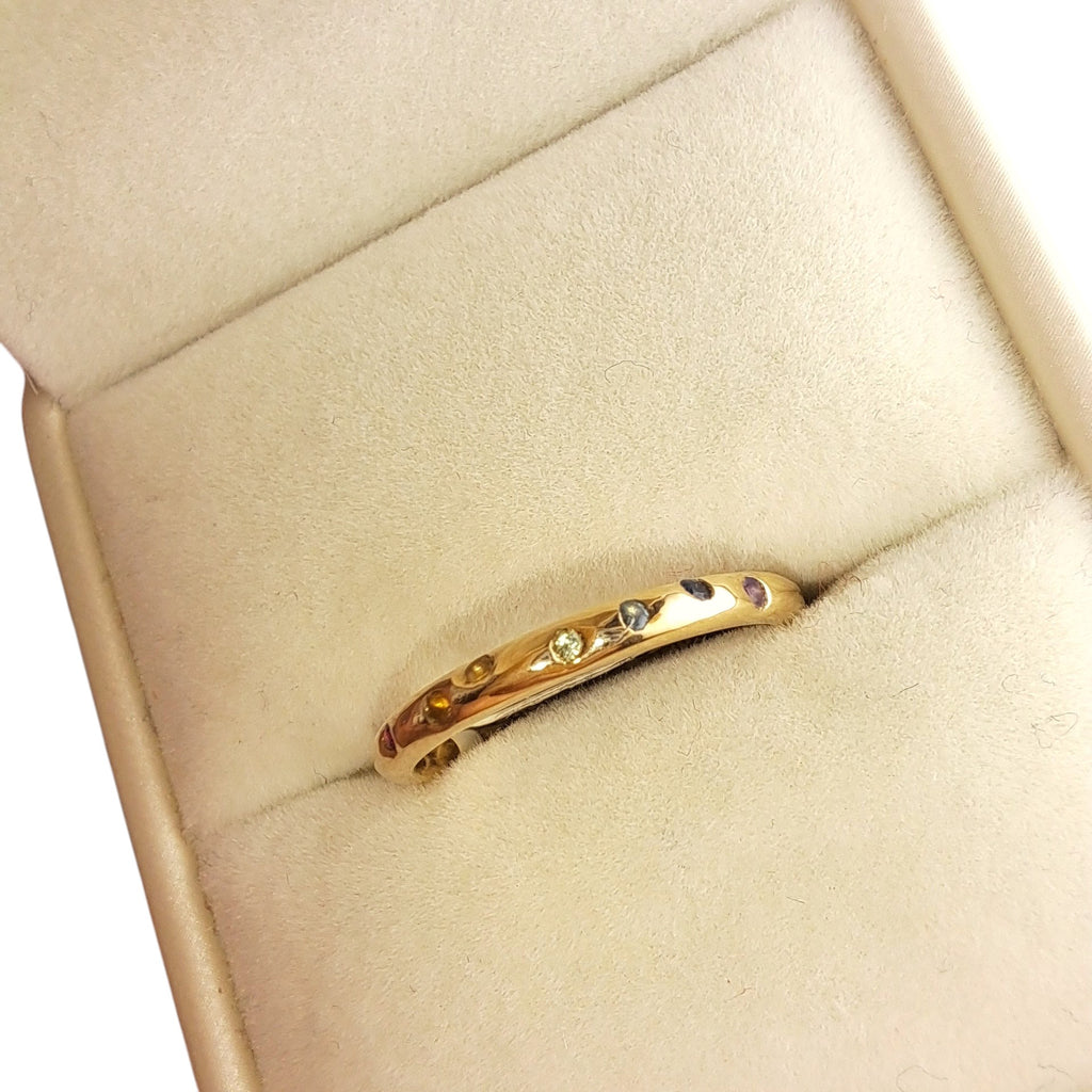 A delicate and beautifully crafted 2mm court band, handmade in solid 9ct yellow gold and sprinkled with a joyful rainbow of seven precious and semi-precious stones.