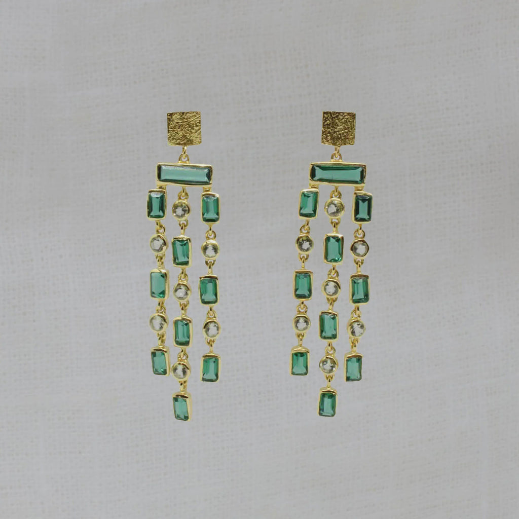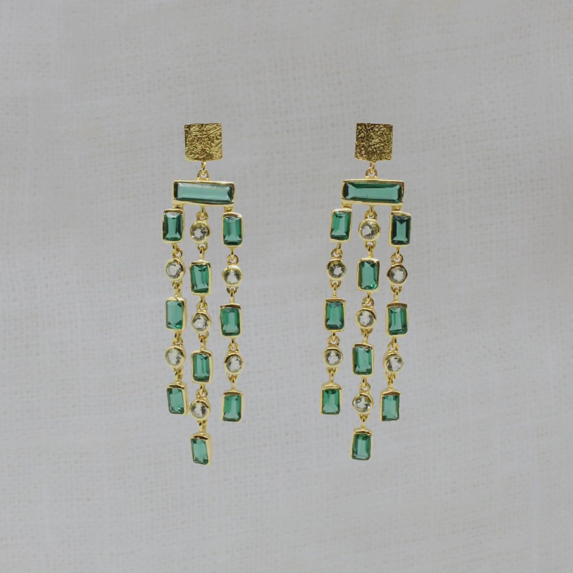 These triple row gemstone chandelier earrings are crafted in 18k gold vermeil. These statement earrings feature a stunning cascade of gemstones arranged in three rows, creating a chandelier effect. The square textured stud fitting adds a modern and sophisticated edge to this timeless design.