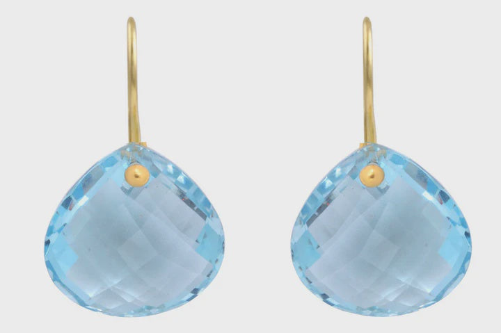 Gold Plated Elisa Blue Topaz Pear Shape Earrings. The discreet hook on these earrings make sure that the fabulous faceted gemstones take central stage. We love the way that the hook subtly loops through these handmade gemstone earrings and is barely noticed.