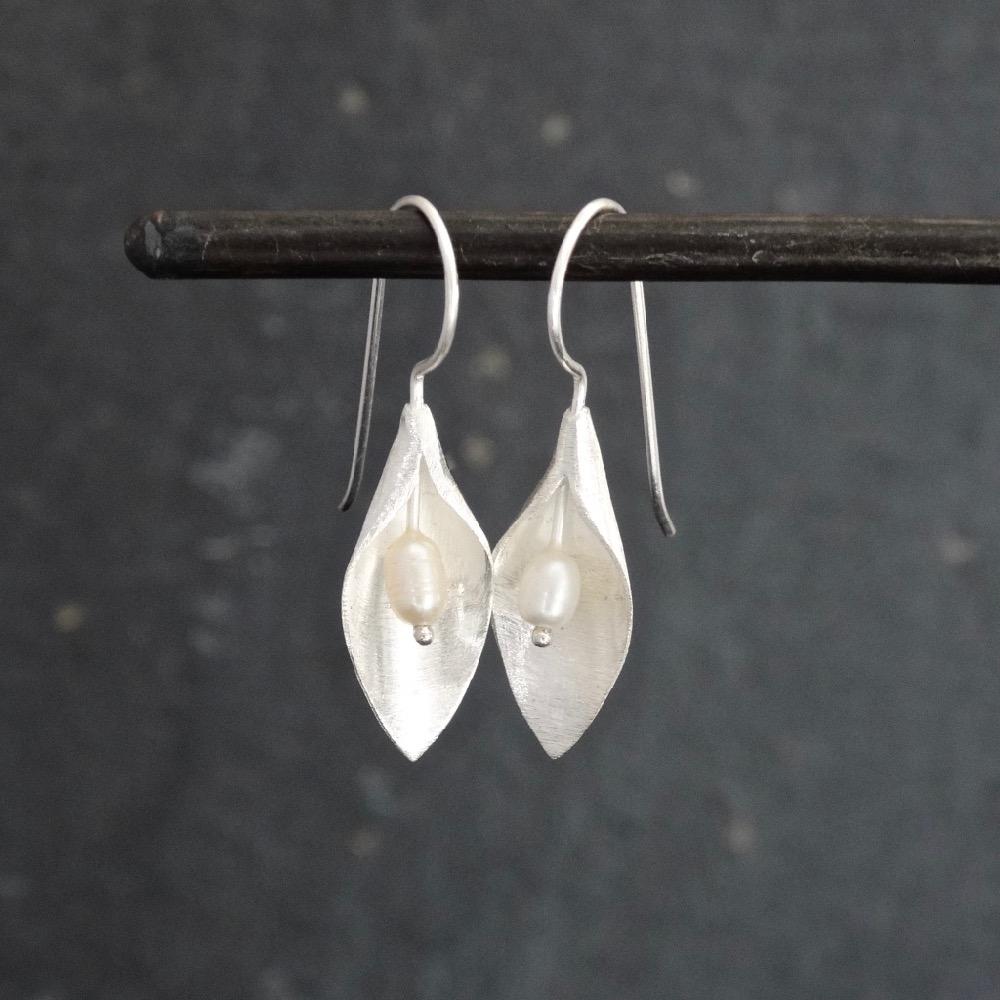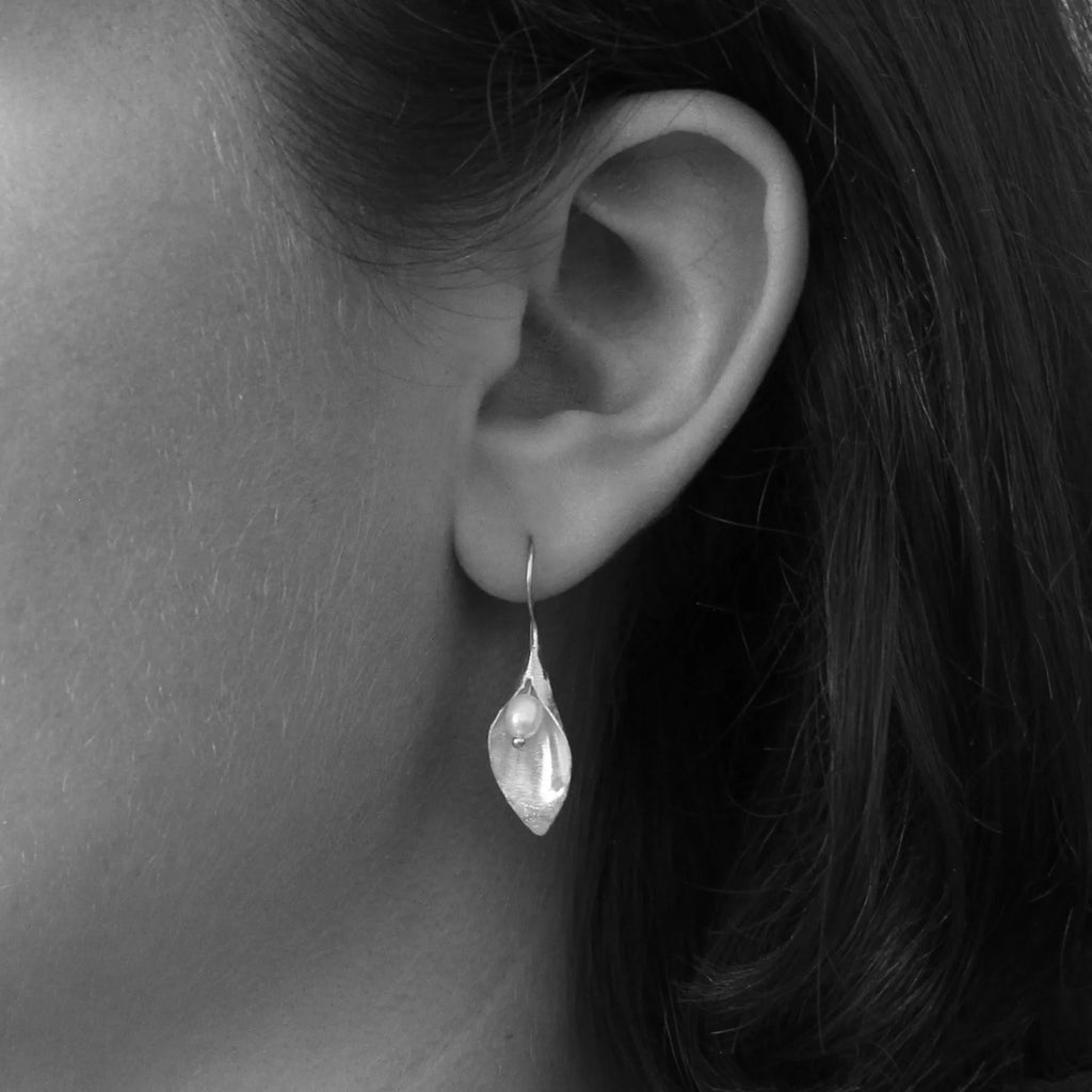 These minimal curved leaf drop earrings are embellished with white freshwater pearls. Available in sterling silver or 18k gold plated silver, both with a subtle brushed finish and a hook fitting.