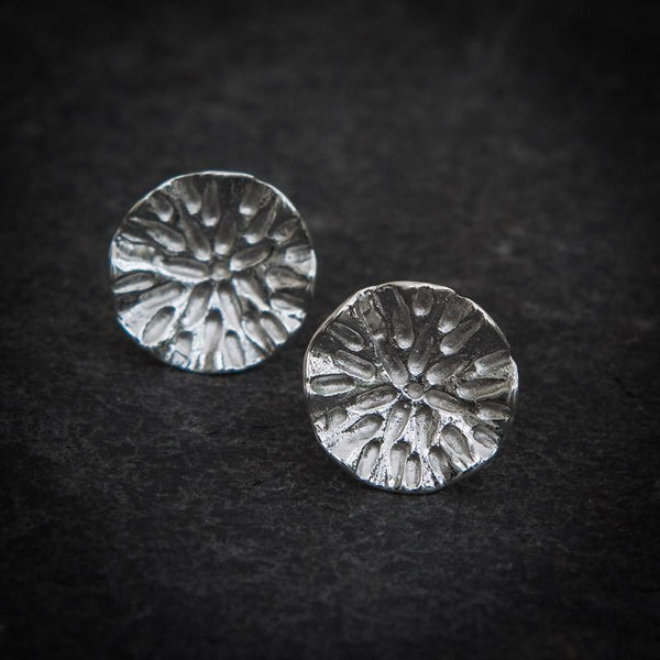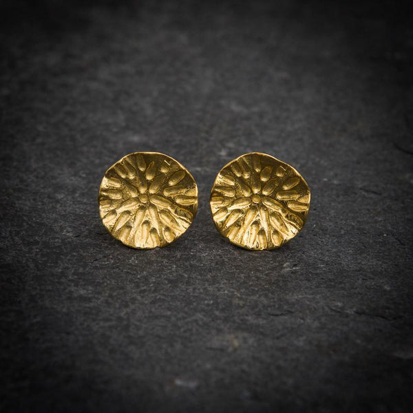 A striking pair of circular gold vermeil stud earrings with an organic engraved design and concave shape. Versatile earrings which can be dressed up or down.