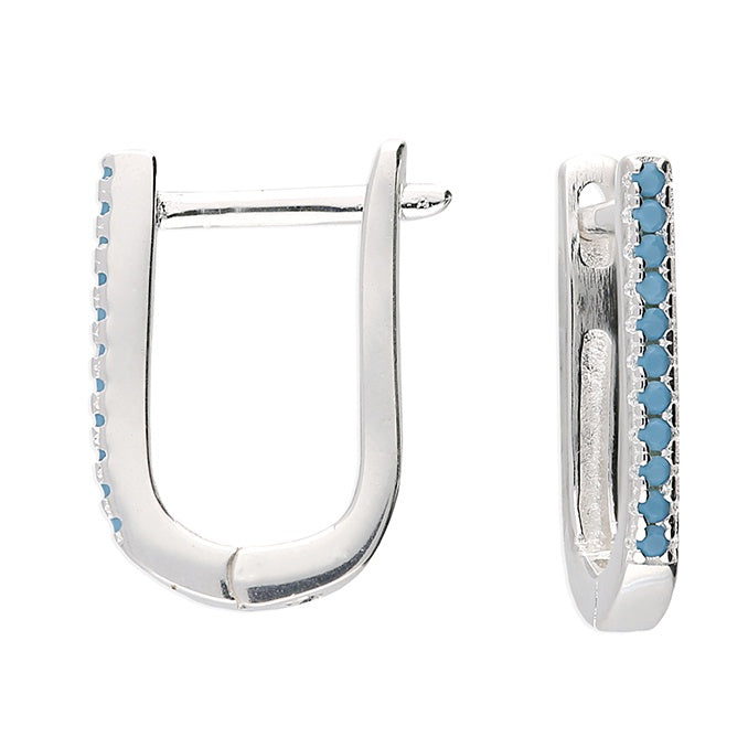 Sterling silver, U-shaped hinged hoops with turquoise cubic zirconia stones.