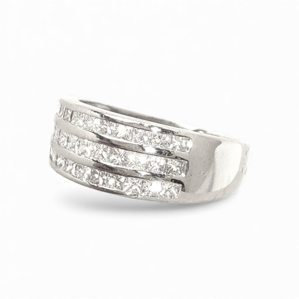 A captivating vintage piece, the Diamond Stream ring features three flowing rows of channel-set princess cut diamonds, shimmering with a total weight of approximately 1ct. Each diamond is precision-set within luxurious platinum, creating a seamless river of brilliance that glides effortlessly around the band. The smooth, substantial design offers a refined sense of luxury and strength, making it perfect as a statement ring or a timeless wedding band.